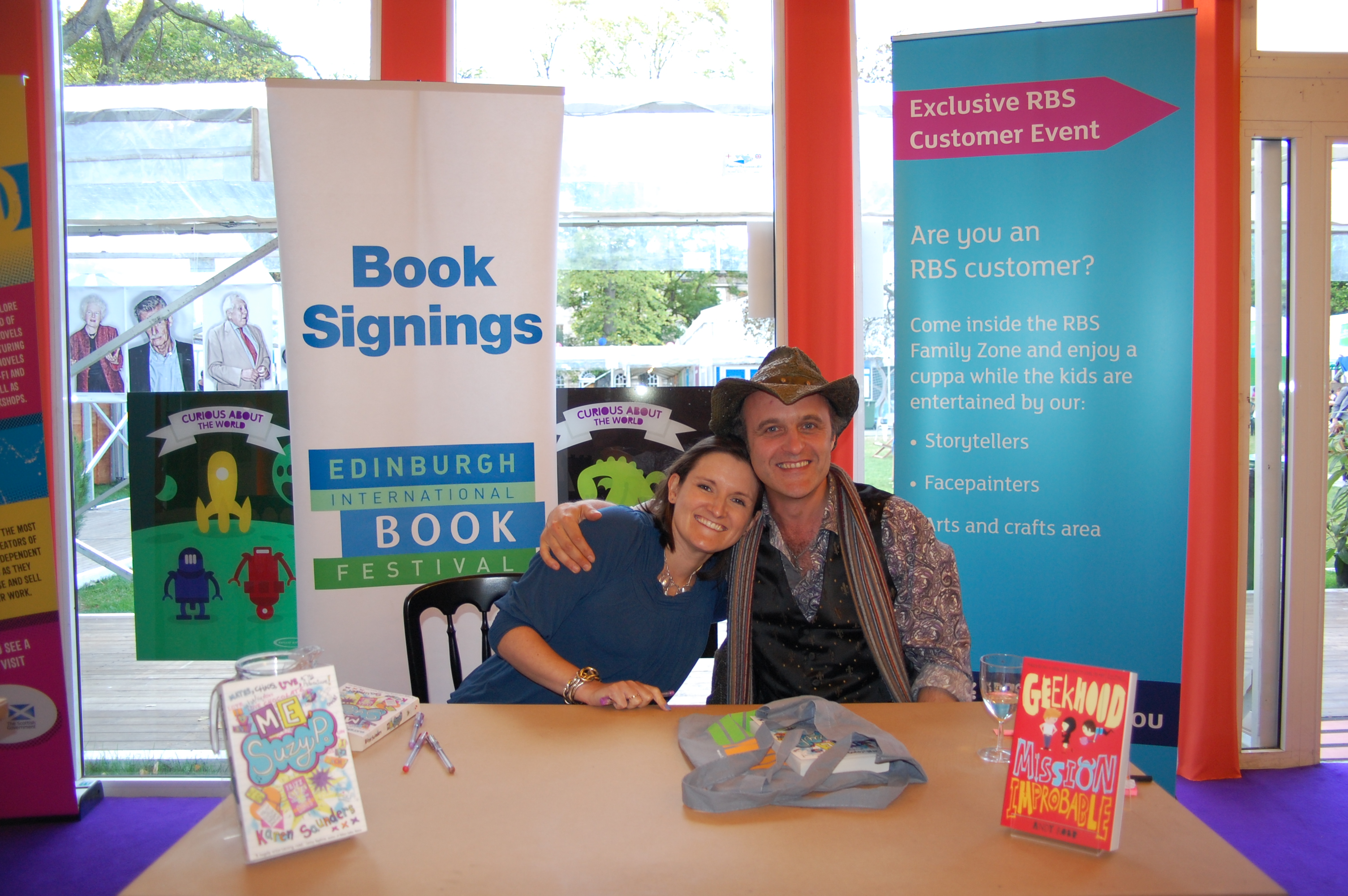 And the event was actually lots of fun. Andy is definitely the ying to my yang. I do not move around during events – for the very real reason there’s every chance I’ll fall over – whereas Andy bounces around all over the place like Tigger, telling animated stories and sitting next to audience members. We were asked questions, answered questions, discussed embarrassment and embarrassing times, and generally had a lovely time. In the blink of an eye it was over, and we were ushered to the book tent to do our book signing. Here I met lots of audience members, including Sister Spooky, blogger extraordinaire, who I’d chatted with on Twitter. It was great to meet her in person, and also met Laura, the publicity manager from Templar, my publisher. I’m not sure I made any sense at all post-event, I was a gibbering wreck with far too much adrenaline in my system. We all went back to the yurt after, and there was STILL a disappointing lack of famous people there. Ho hum. On my way out, I signed the guest book, and, genius that I am, managed to spell Edinburgh wrong. Will be adding that to my list of most embarrassing moments, then.